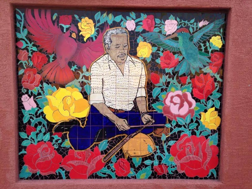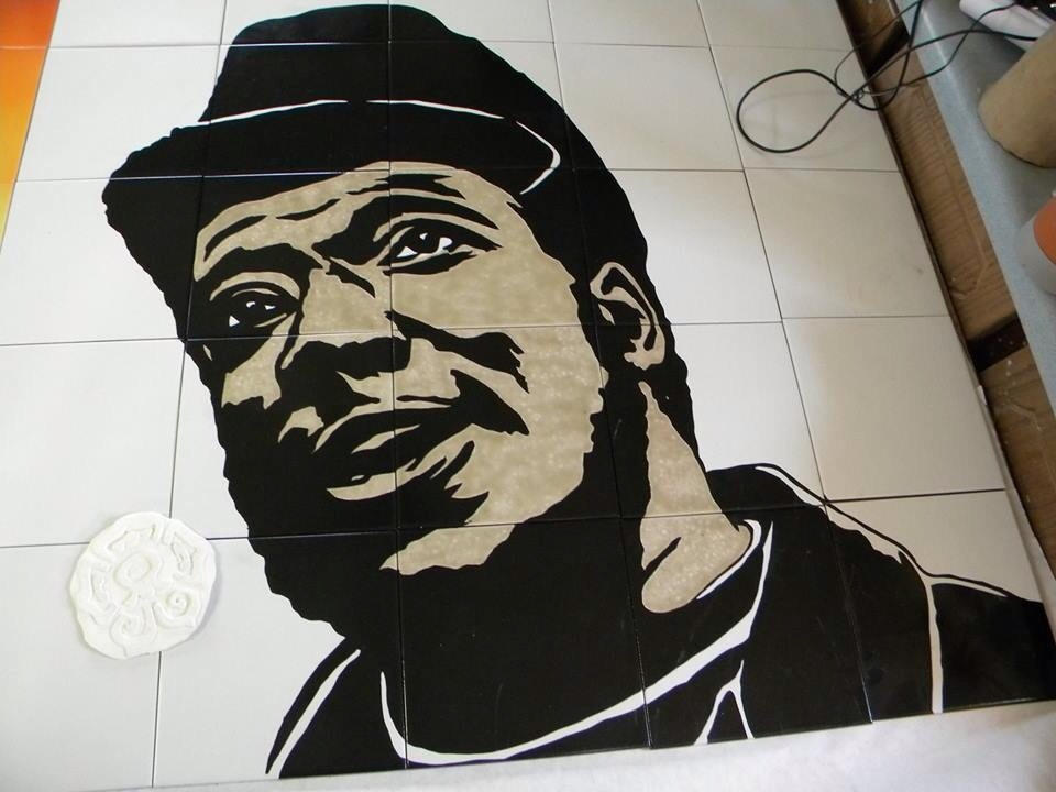 What you’d do as a youth is go to either the House of Neighborly Services in South Tucson or to Carlos’ workshop near Mission Rd. and Ajo Way, to paint and glaze over the tile murals. Below are two examples of Carlos’ work: Fred Hampton (left) and Anselmo Valencia (right).